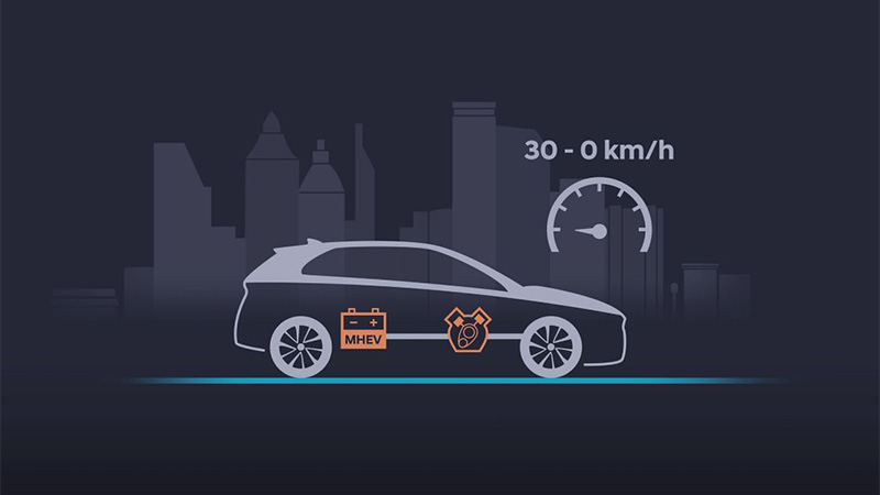 Při aktivním brzdění klikový hřídel pohání mild hybrid startér/generátor a ten převádí kinetickou energii na elektrickou energii s výkonem 10 až 12 kW. Ta dobíjí 48V akumulátor.
